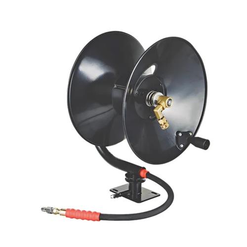 Features• Removable rotating base• Heavy-duty steel construction• Easy hand rewind• 360° Rotation with locking mechanism• 1.2m Leader hose• Hose capacity: 30m x 3/8• Inlet: 3/8 BSP male plug• Outlet: 3/8 BSP female socket• Hose not included