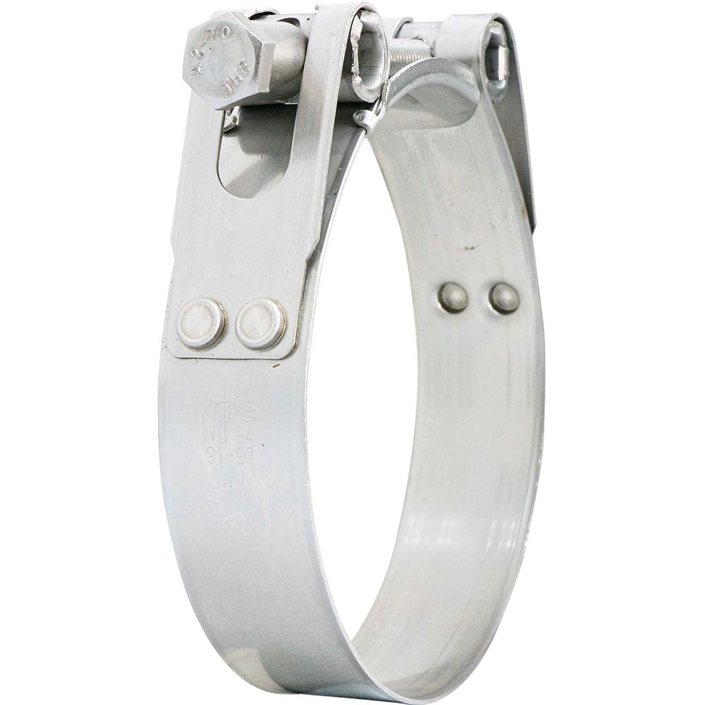 Kale HD T-Bolt clamps are manufactured utilisingTOX®-Clinching joints. A cold forming press technique thatis more than 70%stronger than welding and superior to tabstyle mechanicallocks.Produced in Europe to DIN 3017-3 standards Kale HDT-Boltclamps are suitable for high shore hardness orreinforcedhoses.
