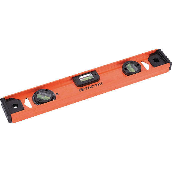 • 1 horizontal and 2 vertical vials.• Rugged aluminium I-beam frame for durability.• Shockproof end caps.• Accuracy 1.0mm/m• 400mm (16 inch)