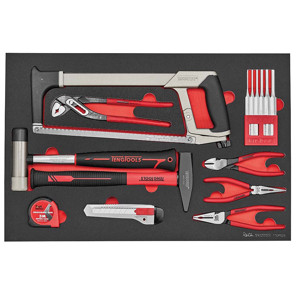 25 piece set containing a selection of general hand tools.The tools are held in place in a 570mm x 375mm EVA threecolour foam bloack for use in the larger Teng Tools drawersand for use as part of the Teng Tools Get Organisedsystem.