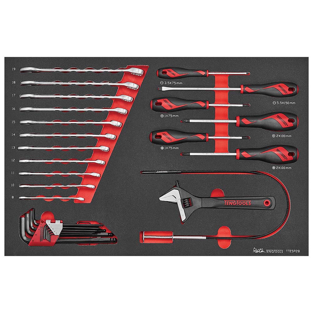 28 piece set containing the most commonly used spannerswrenches and screwdrivers. The tools are held in place in a570mm x 375mm EVA three colour foam bloack for use in thelarger Teng Tools drawers and for use as part of the TengTools Get Organised system.