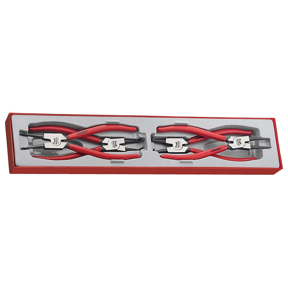 • Set consisting of 4 circlip pliers (2 straight tip and 2bent tip pliers for internal and external circlips).• Fitted with return spring.• Supplied in a plastic TC tray with removable lid.• Fits in Teng Tools tool boxes and roller cabinets.
