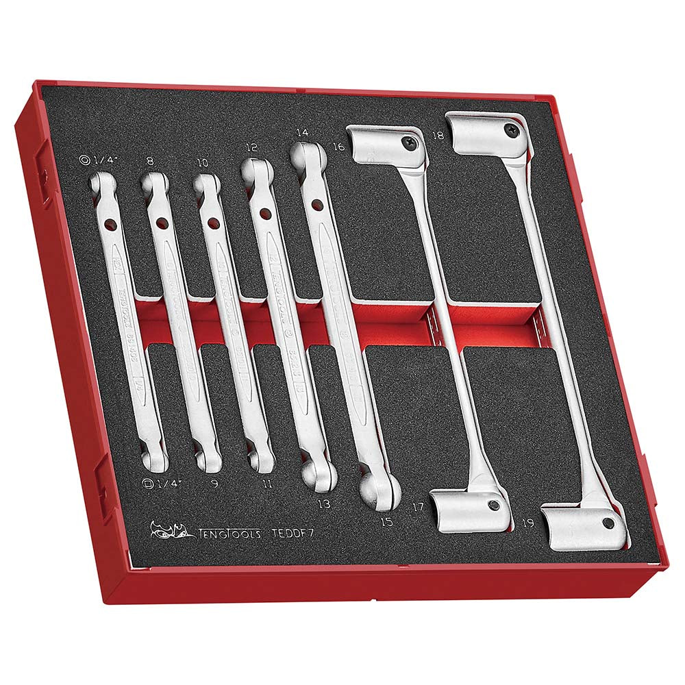 • 7 piece Double Flex Wrench Set.• Supplied in a plastic TC tray with removable lid.• Three colour EVA foam.• Fits in Teng Tools tool boxes and roller cabinets.